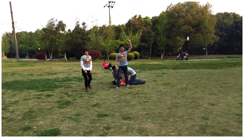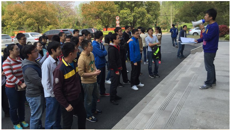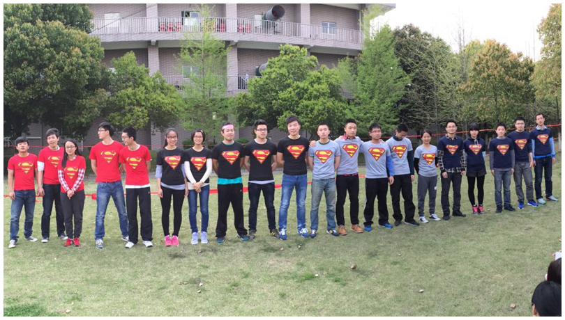 比赛的最后一项是为大家期待已久的“撕铭牌”,这个充满娱乐和体育运动的项目为大家所青睐,大家纷纷脱去外套,穿上我们准备好的超人战服,贴上铭牌,在规定的区域里和对方的队员大撕一番,女生由于在这种肉搏战中与男生战斗力不可相比,每当被男生围堵时,变躺地不起,着实过了一把既当淑女又不会被撕的瘾,最终战斗力绝伦的以姜童辉为首的小组撕掉了所有其他小组的铭牌,登顶总冠军。