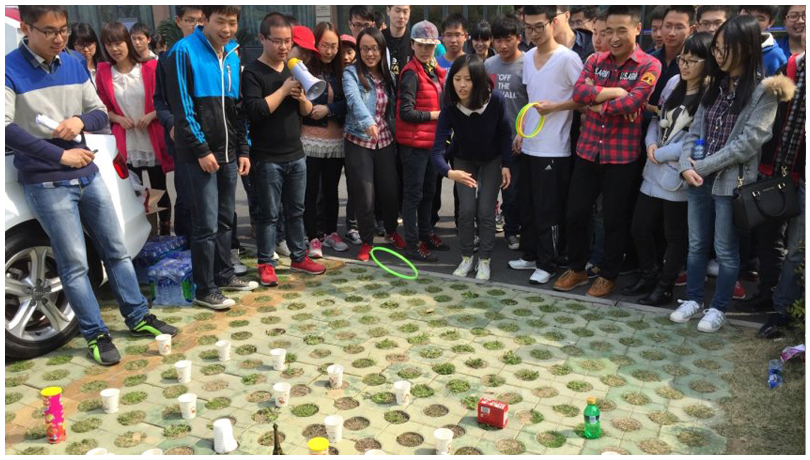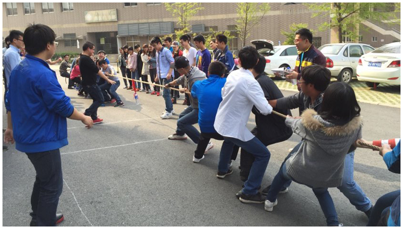 下午2点,运动会准时开始,几分钟内仍有不少同学受到这场运动会声势的影响,希望临时报名参加运动会,我们的工作人员王梦同学一一为其耐心登记。游戏的第一个项目是三人四足,每组派出三名组员相互协作,有些站在中间的同学在比赛中几乎都要飞起来了。接下来就是老少皆宜的套圈,每个小组都有十个圈,共有8组同学,分别抽签决定顺序,各路套圈高手纷纷出马拿下我们所摆设的零食,娃娃,杯子等等,大家玩得是不亦乐乎。第三项是运动会的传统项目:拔河,我们采取十人次比赛的规定,两女生算一个男生,最终李韩所带领的研二代表队,虽然女生居多,男生甚少,但是巾帼不让须眉,连下三城夺得总冠军,师姐们的战力在比赛中凸显得淋漓尽致。比赛第四项的“男生女生向前冲”给了许多情侣浪漫的好机会,男生背上自己的女朋友飞奔向前,自己或两人同喝下一瓶矿泉水后返回原点,虽然最后的冠军为实力战将杨康和范梦琳同学所得到,但是比赛过程中情侣们互相鼓励,点点温馨的场景依然是羡煞旁人。