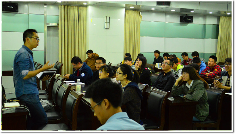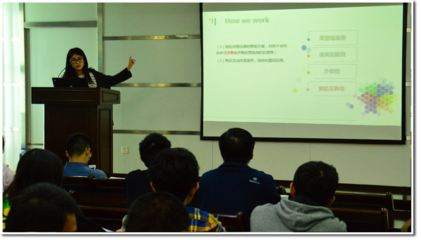 接着,另一位项目负责人郑凯登台,开始给大家做项目技能培训。他在一开始就设置了一个案例情景,然后分别从策划、宣传、外联、赞助四个职能小组的角度入手,分析应该怎么办?怎样从情景提炼出创意,为我所用。演说言简意赅,深入浅出,获得了一致好评。