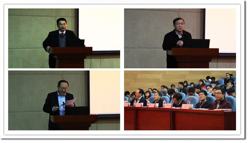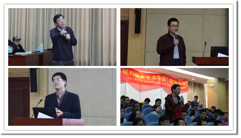 随后,特邀嘉宾严以京教授、江海龙教授及马明明教授分别进行了精彩的特邀学术报告。严以京教授以“开放体系量子力学方法进展”为主题,为到场的老师和同学带来了有关量子力学在开放体系中的进展与应用的报告,引起了与会老师和同学们的极大兴趣。江海龙教授则为大家做了有关金属有机骨架以及其复合材料的报告,由浅及深地介绍了自己在探究金属有机骨架复合材料方面的研究探索。马明明教授,就基于导电聚合物的脑-机接口电极和柔性发电机这一主题,向大家展示了在该课题研究上的进展与感悟。