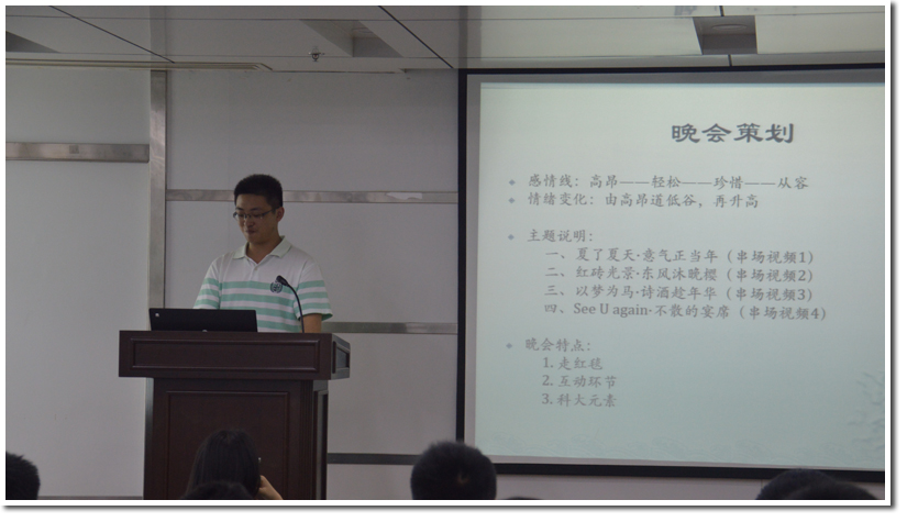 紧接着,各职能小组组长介绍了目前的工作进展状况和下一阶段的工作安排。策划现场组组长梁榉曦介绍了他们初步拟定的晚会方案,并透露了今年毕业晚会最大的创新点“红毯”和“T恤走秀”的设计安排。