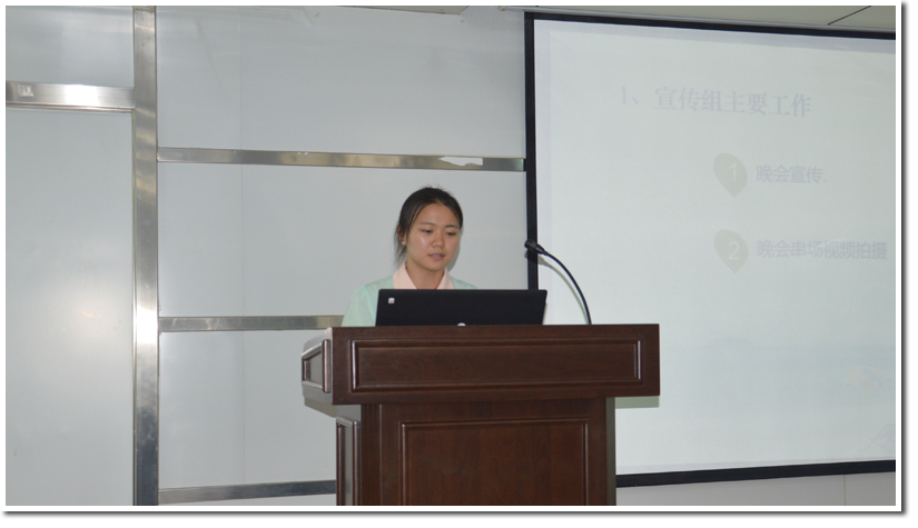 宣传组组长李文洁介绍了毕业晚会前期整体宣传工作并对下一阶段串场视频的拍摄工作做了具体安排。