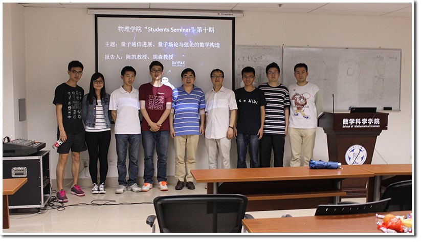 “Students Seminar”作为物理学院研究生会的特色活动之一,旨在向同学们传播有趣、好玩的当下研究热点、前沿的理论以及最新的研究进展,从而开拓大家的视野,激发大家的科研热情。本期活动紧靠“量子”这个主题,我们邀请到微尺度国家实验室的陈凯教授和数学学院的胡森教授,为大家分别做了“量子通信进展”、“量子场论与弦论的数学构造”两场报告。本次报告受到了全校学生的积极关注,现场出现爆满状况!