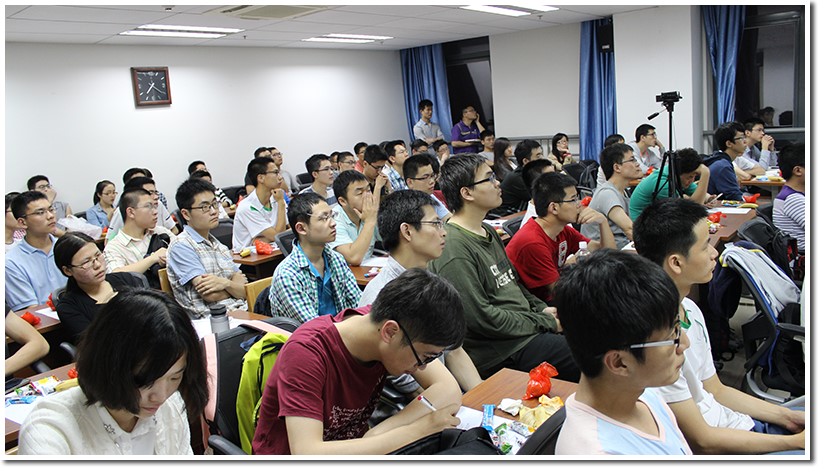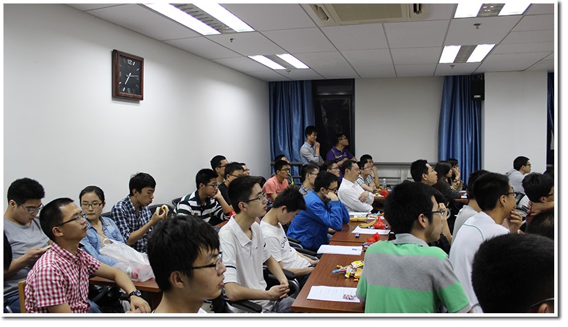 下午六点,来自物研与数研会的活动工作人员就来到报告现场,分发零食、调试设备,完成了场地布置。随后在六点一刻,就开始出现参加报告的同学,六点四十五,同学陆续就坐,会议室已经爆满。然而人数还在增加,会议室几近饱和,为了同学更好的观听感受,工作人员赶紧前往数院自习室借来椅子。