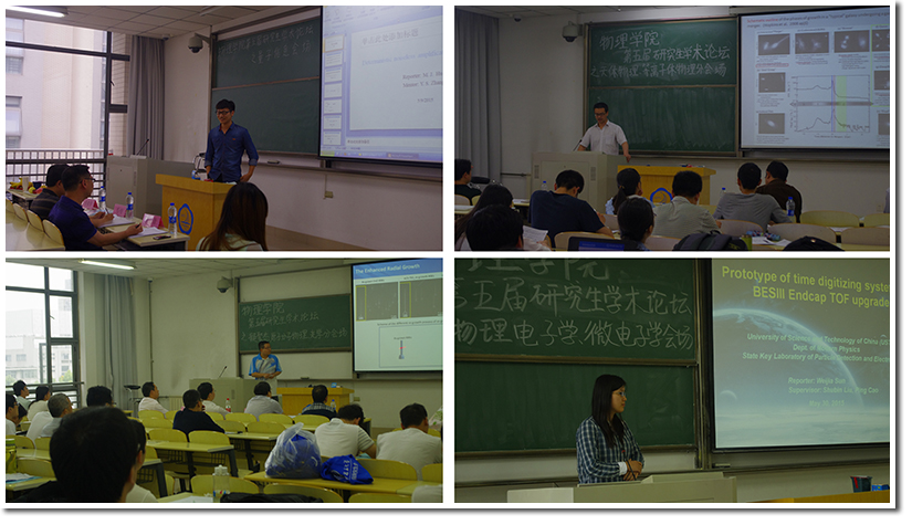 2015年5月29日下午,第五届物理学院学术论坛在第五教学楼5504成功召开。本次学术论坛由物理学院研究生部、物理学院分团委主办,物理学院研究生会承办。 来自物理学院各专业的13位评委老师,以及物理学院的43名研究生参加了本届论坛。