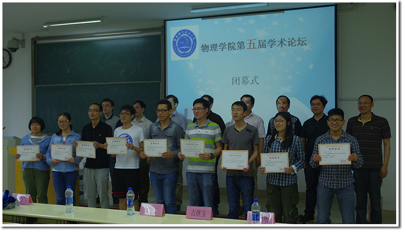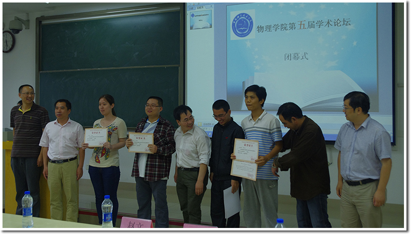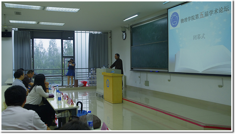 报告结束后,由张增明教授主持了本次学术论坛的闭幕式。在闭幕式上,刘万东教授作为评委代表对本次学术论坛进行了点评。刘万东教授说:“我们物理学院的各个学科都是相当的在国际有一定的地位,所以我们的研究生代表了整个物理学院的工作,尤其是来做报告的同学,应该代表了这样的一个水平,所以这个报告还是相当精彩的,大家可能是第一次做这样的报告而且用的还是英文,可能有一点点不适应,但是表现的都还是不错的。”刘万东教授还提出,虽然物理学院要求研究生在研究生阶段必须参加一次学术论坛,但是希望大家是抱着积极主动的态度参加会议,能够抱着很好的心情参加交流。