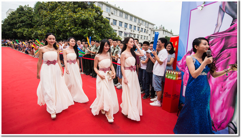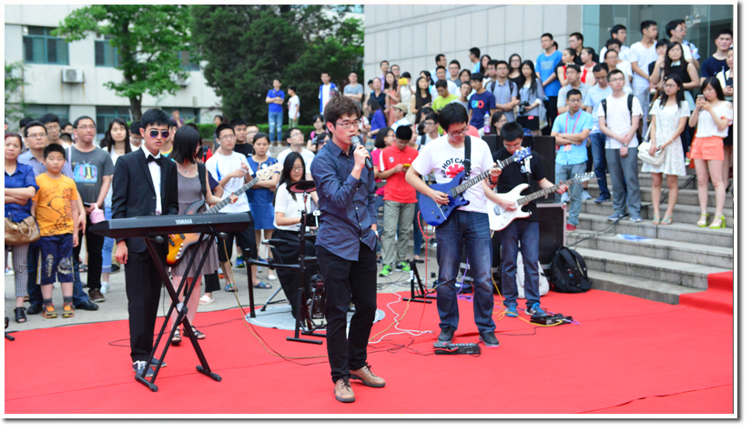 红毯走秀由吉他社的同学开场,激情的音乐引起校园内不少同学的围观。