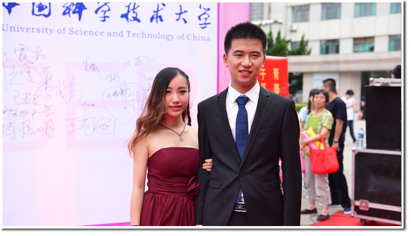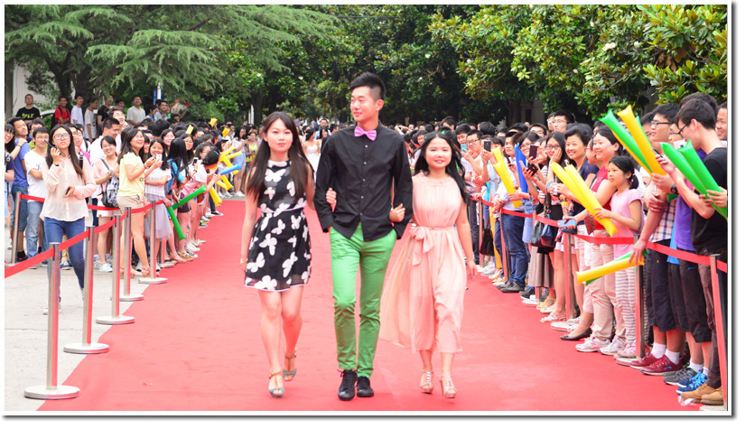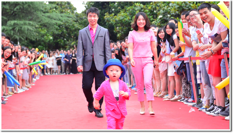 红毯走秀的最后一组----来自于近代物理系12级博士班的张宇以及他的妻子汪秀英和儿子张思齐,作为学业、爱情、家庭全丰收的典型,备受瞩目。