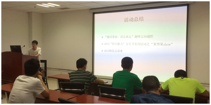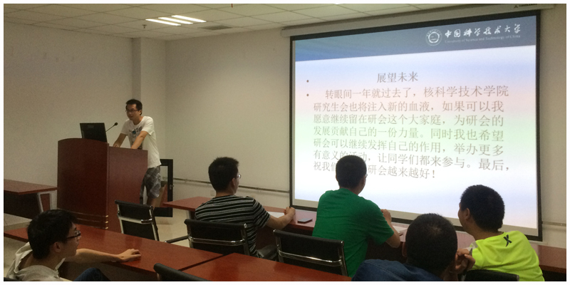 接下来,核院研会三位骨干分别汇报了自己在这一学期的工作经历。刘琪同学和陈俊同学分别对参与的工作进行陈述,并对未来研会工作提出自己的看法。然后王帅同学(研一,和现任研会主席重名)分享了在校研会挂职一学期的工作经历,以及介绍校研会和院研会的不同之处。