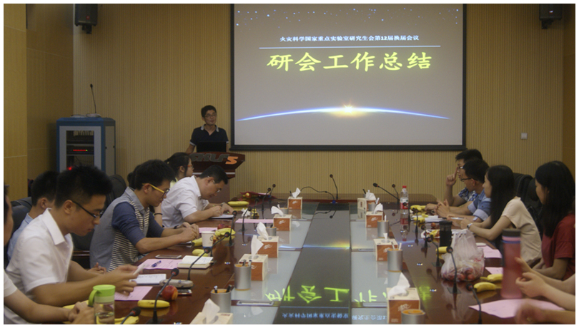 换届大会由现任主席王志刚主持。首先,王志刚师兄对火灾实验室研究生会一年以来开展的活动进行总结报告。火灾实验室研究生会在这一年多时间以来,积极配合学校开展各类学生活动,与各兄弟院系进行广泛深入合作。与此同时,火灾研究生会还多次走出校外,联系安徽大学、合肥工业大学、安徽建筑大学联合开展火灾科学交流会;协同同步辐射实验室与江西卫视开展“顶级对决”合肥赛区的选手征集选拔工作。在独立开展的学生活动中,“HELLO USTC”、2015科技活动周两项参观活动累计接待校内外参观人员一万多名;“纪念12.9微型马拉松”荣获校优秀组织奖;“女生节”活动获校评比二等奖;“See You 情定科大”活动荣获校评比二等奖。在火灾研会全体成员的共同努力下,火灾研究生会在全校17个单位的评比中,以总成绩第一获得“五星级优秀院系研究生会”荣誉称号。王志刚师兄对研会同学一年多的努力做出了充分肯定,随后在离任之时他代表老干部对即将上任的新一届研究生会干部提出重要建议。