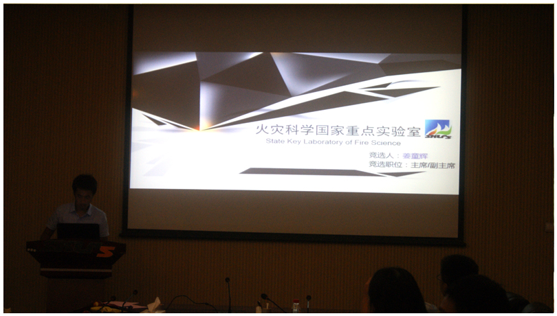 在报告结束后,换届竞选正式开始。主席竞选人姜童辉率先上台做竞选演讲,在演讲中他总结了自己的一年以来的工作成果,并对自己的优势做出简明扼要地阐述,最后他对研究生会的未来做出规划展望,最终姜童辉获得24票中的22票成功当选火灾实验室第十二届研究生会主席。全体成员向他表示祝贺,他也对一年以来给予开展工作支持的团委老师、师兄师姐、研会干事表示感谢。