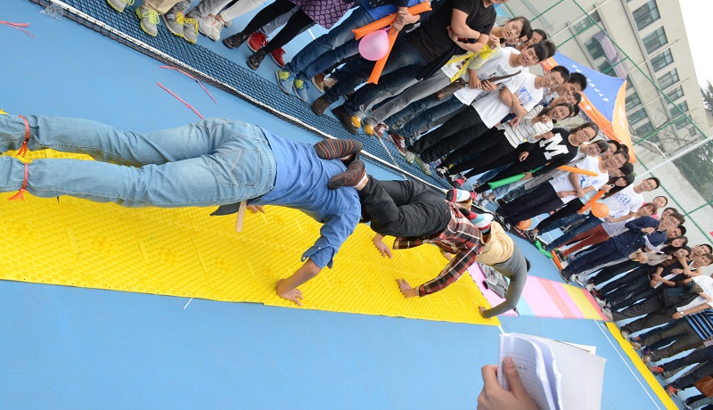 紧接着,游戏以大规模的踩气球开始,11个队伍采取结盟策略,分别进行对战,最后决出三个部门胜利。紧接着,大型指压板活动开始,从刚开始的两人跳绳、面粉里找糖、三人俯卧撑、身体传球、劈叉传球、背人扔鞋形成了系列活动,这是一个极具考验团队合作。每个队伍在正式比赛之前都进行了多次尝试,力求能拿到一个好的成绩。在“三人俯卧撑”和“两人跳绳”活动过程中,部员们都发出一致的口号声,作出一致的动作,从而体现出了各部门成员之间的默契和凝聚力。最后一个项目——女王躲避球,更是尤为激烈,各个部门通过抽签的方式确定自己的对手,并分别派出10人队伍进行女王躲避球大赛,通过一番激烈的比赛之后,创发部、女生部和代培生工作中心在此次项目中取得了胜利。