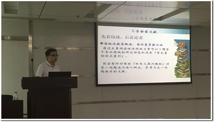 沙龙活动开场后,主持人首先为参与活动的研一新生介绍了各位师兄们优秀的科研成果以及学生工作经历。接着,由代胜瑜师兄与我们分享了如何与老板进行交流及如何融入课题组的经验。本次沙龙虽然是以学术科研为主题,但是代胜瑜却以风趣幽默的语言讲述了发生在他的实验室的一些“趣事”,以这些趣事为例分享了自己为人处事的经验,使得活动现场气氛十分活跃。最后,他总结搞科研要有独立思考的能力,待人待物也要讲究方法。
