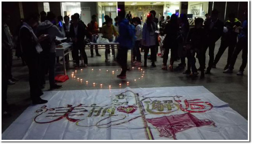 活动当天,现场使用了荧光粉涂写的美丽邂逅海报,再加上蜡烛围成的心型让整个氛围变得浪漫且唯美。