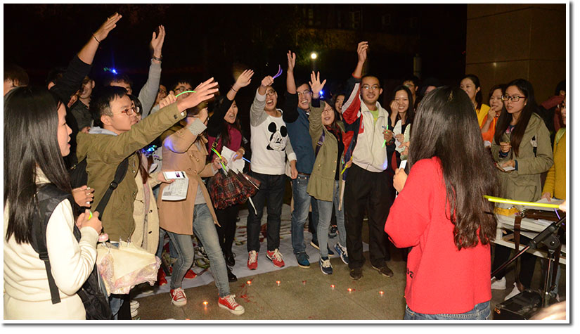 18:00活动准时开始,主持人黄梅首先向大家介绍了介绍美丽邂逅校内抢票方式和活动设置的奖品,整个活动分为三个环节:唱歌、有奖竞答、游戏环节。