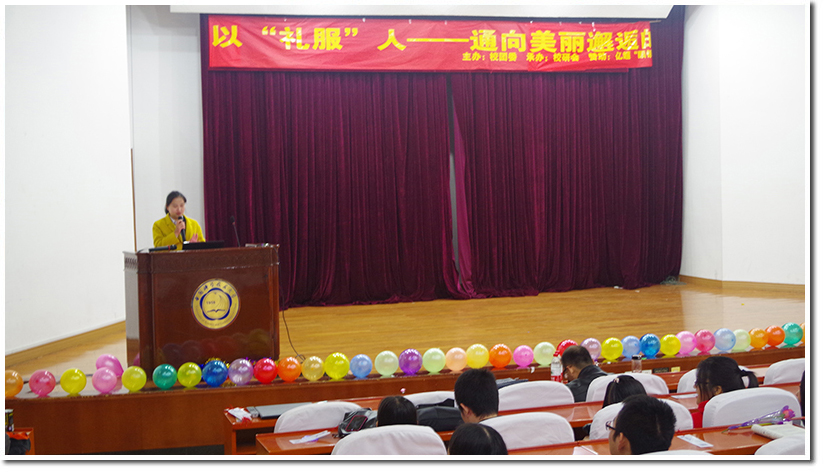2015年11月8日晚7点由校研究生会举办的美丽邂逅之以“礼服”人活动在东区水上报告厅正式拉开序幕。活动形式以讲座中间插入互动活动为主,向科大学子传播沟通交往礼仪与服饰穿搭技巧,讲座由资深专家江家熠老师和夏欣老师主讲。