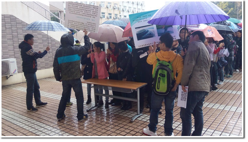 之后工作人员调整了排队队伍,分成线下发票和线上获券发票那个队伍。尽管还在下雨,同学们还在打伞等待发票!