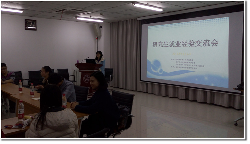 12月6日晚,由中国科技大学校团委、化学与材料科学学院分团委、化学物理系团总支主办,由化学与材料科学学院研究生会承办的“求职航标”系列活动---冬季研究生就业经验交流会在环资楼939会议室成功举办。此次活动共四位嘉宾受邀出席,他们分别是招生就业处王娟老师,2016届毕业生19系硕士夏修阳, 2016届毕业生20系硕士胡晓慧以及2016届毕业生20系硕士黄浩智。参加本次交流会的观众主要是2016届毕业的研究生,也有来自低年级的研究生。