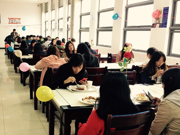 中午时分,东区东苑食堂、西区研究生食堂开辟女生专属区,被精心装饰过的桌椅,每个桌子上放置的花束,让女生在男女比例7:1的学校里,感受到特殊的关照。