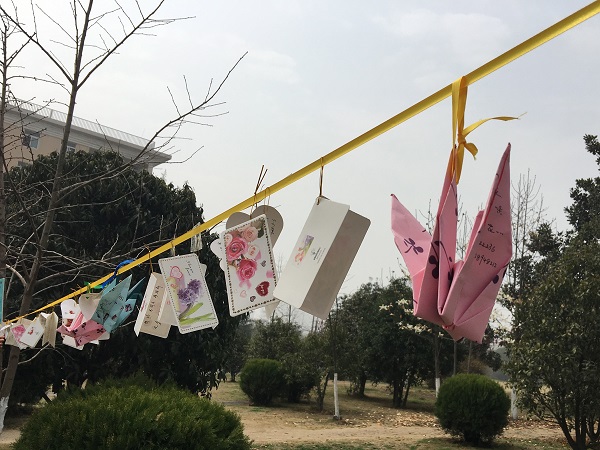 食堂外的路边,小小心愿卡随风摇曳。女生们写下心愿,男生真正为他们去实现、完成,得到切实的关爱和实惠。