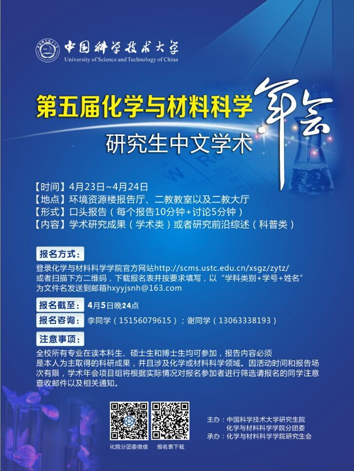 请有意参加各分会场报告的同学于2016年4月5日24:00前将【按要求填写】的申请表格发送至hxyyjsnh@163.com(联系人:谢同学;联系方式:13063338193),邮件主题为“研究生化学学术年会报名”;并于4月5日24:00前提交论文摘要和墙报的电子版图片。