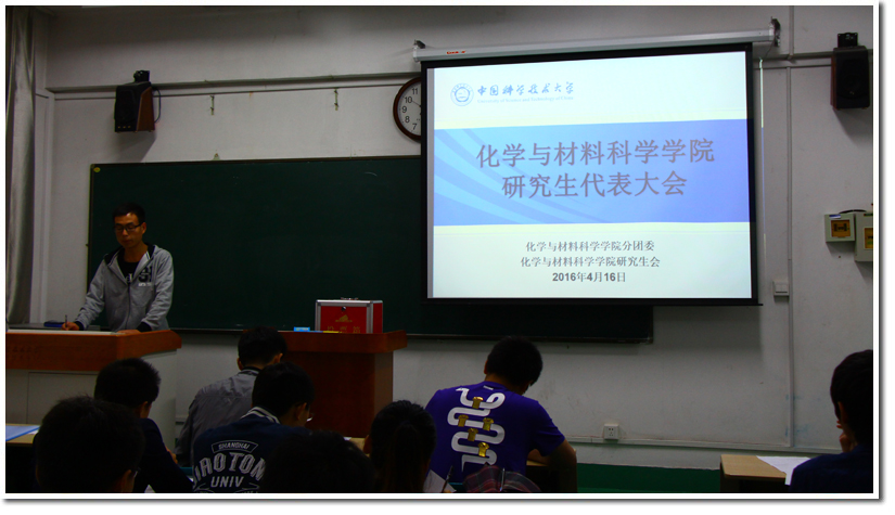参与本次化院研究生代表大会的班级代表都是以班级为单位,通过民主投票的方式产生的能够代表各班级同学意愿的研究生代表。各位校研代会的代表候选人通过简单的个人陈述向出席本次大会的同学,简单地介绍了自己在学生工作方面的经历与感想,也包括了对提议内容的举例等,各候选人承诺愿意代表化院全体研究生发生自己的声音,并且希望通过自己的切身努力与实际工作为化学院,为科大的学生工作贡献自己的力量。