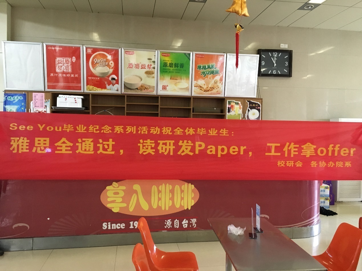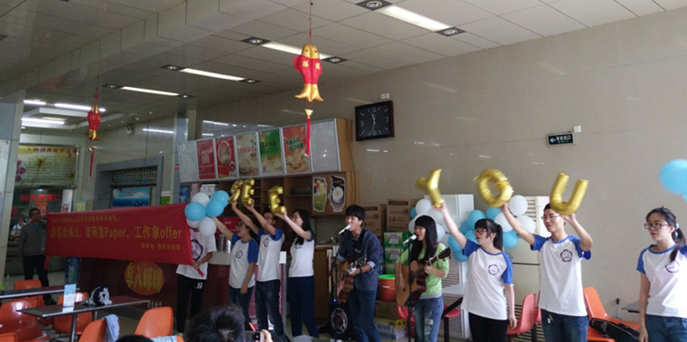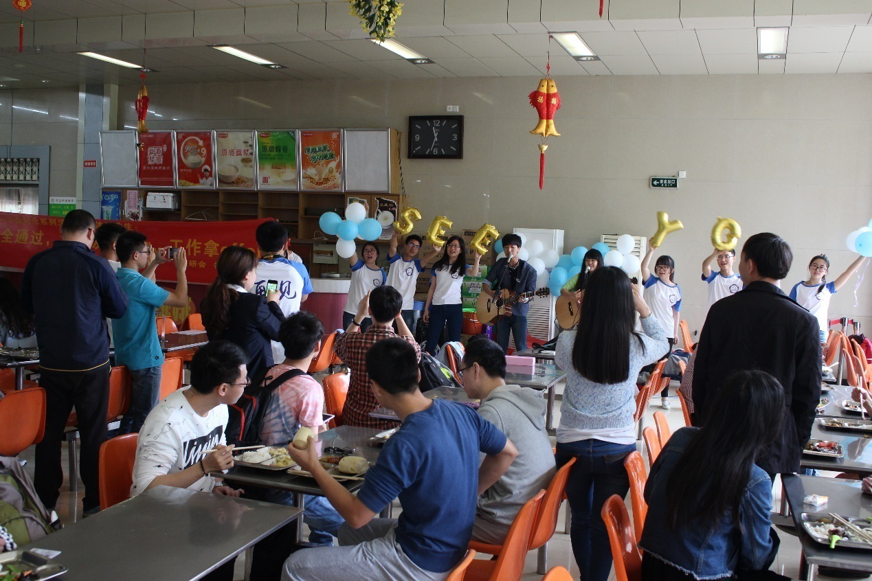 2016年5月23日中午11点半,在东区学生食堂大厅,当大家都在享用美食时,食堂内传来一阵歌声——“再见了,互相嫌弃的老同学,再见了,来不及说出的谢谢,再见了,不会再有的留堂作业,再见了,我留给你毕业册的最后一页 ”。