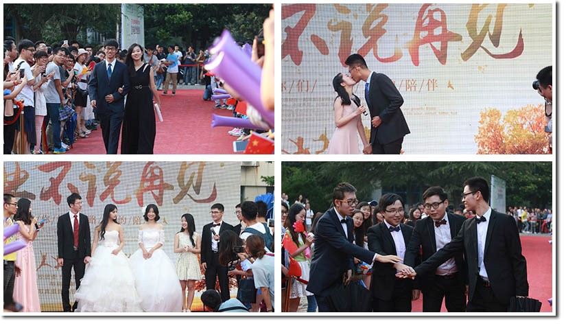 红毯走秀在晚会开始前,于晚5:40在东区大礼堂外隆重上演。雨后初晴,彩虹映现,为这场红毯秀增添了别样的惊喜。16组盛装打扮的毕业生们吸引了众多同学和校内外媒体的目光。这16组毕业生分别来自科大的各个院系和在科大代培的中科院各所代培生,他们以情侣、寝室闺蜜、同学、好友、家人等身份组合在一起,或是身着西装,晚礼服;或是身着旗袍、婚纱;或是身着自己设计的创意服装,在签名墙上写上自己的名字,而这条由无数闪亮回忆铺成的红毯上有他们的点缀,变得更加星光熠熠。