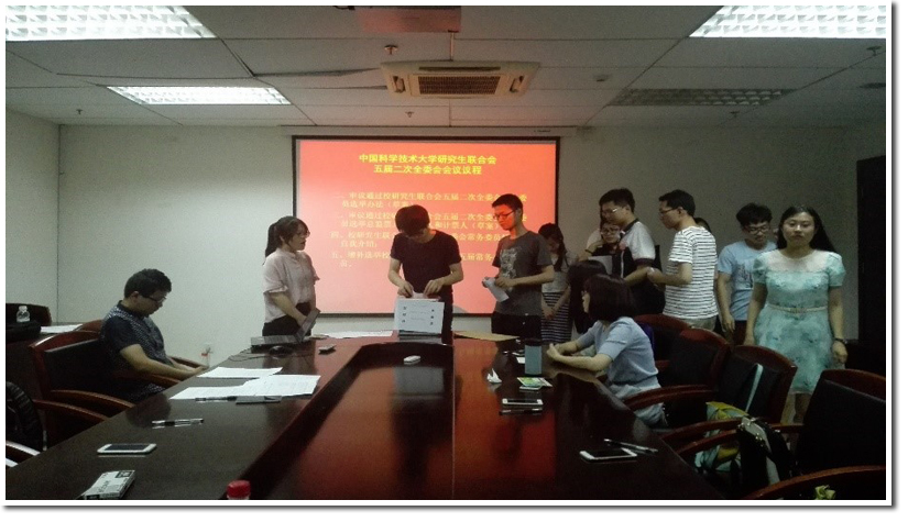 2016年6月13日晚上,中国科学技术大学校研究生联合会第五届二次全委会在管理科研楼1018顺利召开。校研究生会联合会第五届委员会委员参加了会议。本次会议由校研究生会主席解虎跃主持。