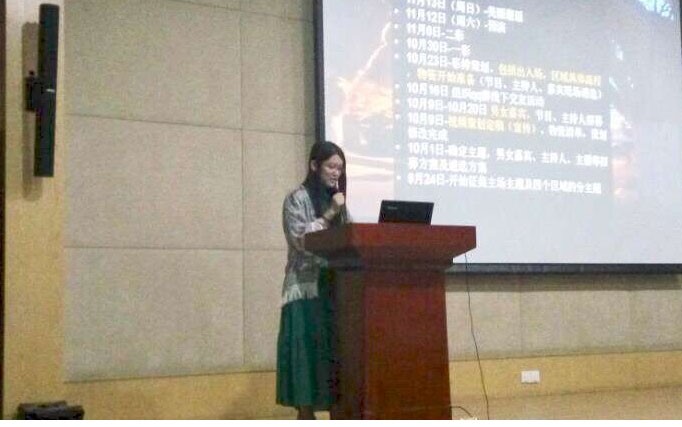 紧接着是各职能小组组长对各自的工作进行介绍。首先登台的是策划组组长苏梦醒,梦醒从组员介绍、工作划分、时间节点控制三个方面进行项目整体策划上的展示,并就活动现场三个区域(晚会区、交友区、多功能区)的规划与布置、晚会之前的预热活动作出的创新和提升进行了阐述。
