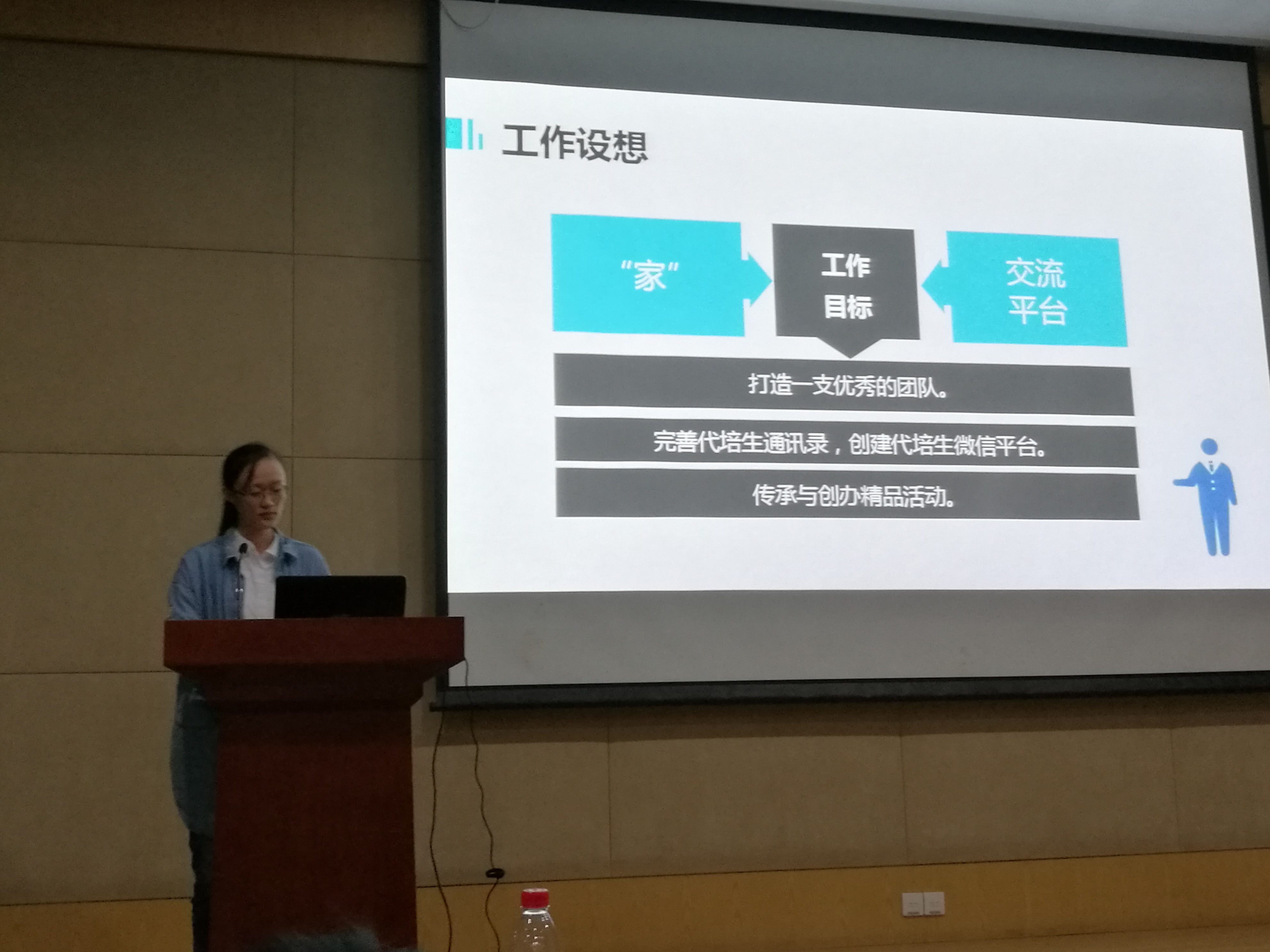 接下来,校研究生会外联部部长施倩对代培中心活动组织形式,对往届代培生中心的活动进行了回顾,并对大家来加入代培生工作中心表示欢迎。随后,校研究生会副主席、代培生工作中心秘书长张艳敏对代培中心的组织结构设置及其相应的工作模式进行简单的介绍,并再次对大家来加入代培生工作中心表示欢迎,同时对新一届的代培中心寄予了几点期望。