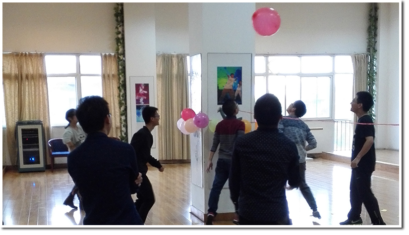 第一个进行的是叠报纸游戏,将2张报纸放在地上,每张报纸上站4个人(同一队伍),两队人员分别派出一名代表进行猜拳,输的小组须将脚下的报纸对角线对折后再站在上面,直至同一队伍人员全部站不上去的队伍输(每个人的两只脚都必须全部在报纸上)。场面十分激烈,每个小组都使尽各种办法,尽量在一张小小的报纸上站上4个人。最后由“对不队”拿下冠军。然后进行的是排球比赛活动,每组成员在一个2米宽,6米长的长方形的场地上,用气球做排球,采取一局三球两胜定输赢的规则,使对方气球先落地或者出界的队伍算作获胜。每组参赛成员头脚并用,使出各种办法,展现出高超的球技,将现场的气氛带上了高潮。