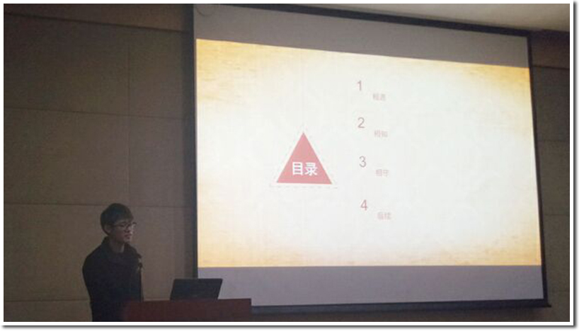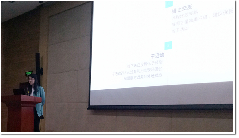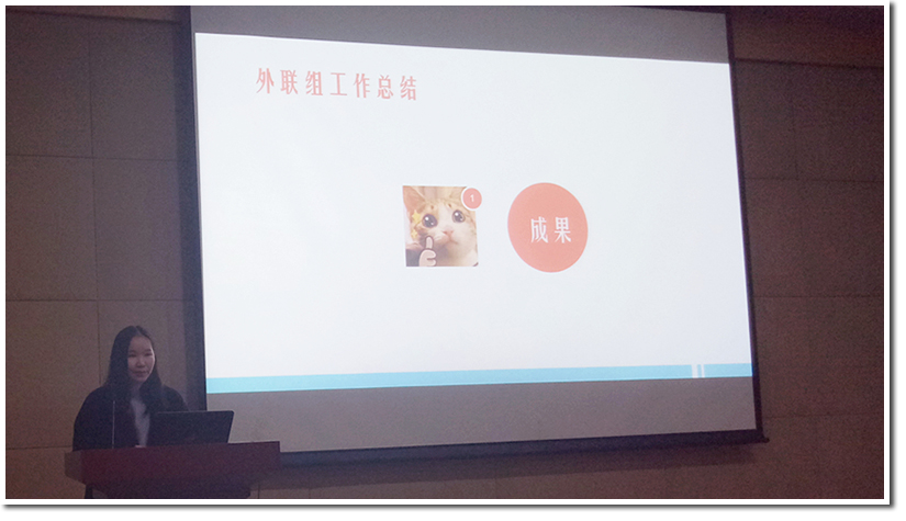 首先,项目负责人孙陆乐宁整个项目进行了总结,她指出了本次活动项目组的努力,具体说明了四个职能组的努力成果,同时也提出了活动的很多不足,对美丽邂逅做出了反思,希望来年的美丽邂逅能够加以改进。