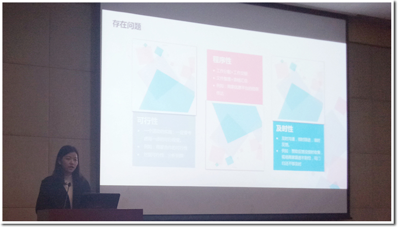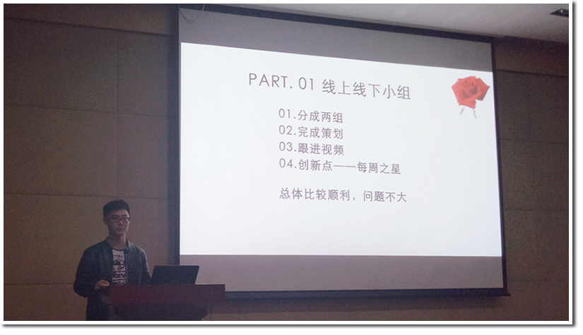 紧接着,各职能小组组长,策划组组长苏梦醒,宣传组组长程铭,赞助组组长时笑,外联组组长朱胤臻依次提出了项目进行中所遇到的问题,并且指出了项目运行中的不足。策划组肯定了线上交友的成果,宣传组指出了宣传过程中出现的工作分配不均等问题,赞助组从可行性、程序性、及时性三方面对活动进行了反思,外联组指出了在联络、沟通等方面存在的问题。与此同时,各小组组长对项目组成员表示感谢,通过项目活动增长了所有成员的能力,加深了大家的感情。