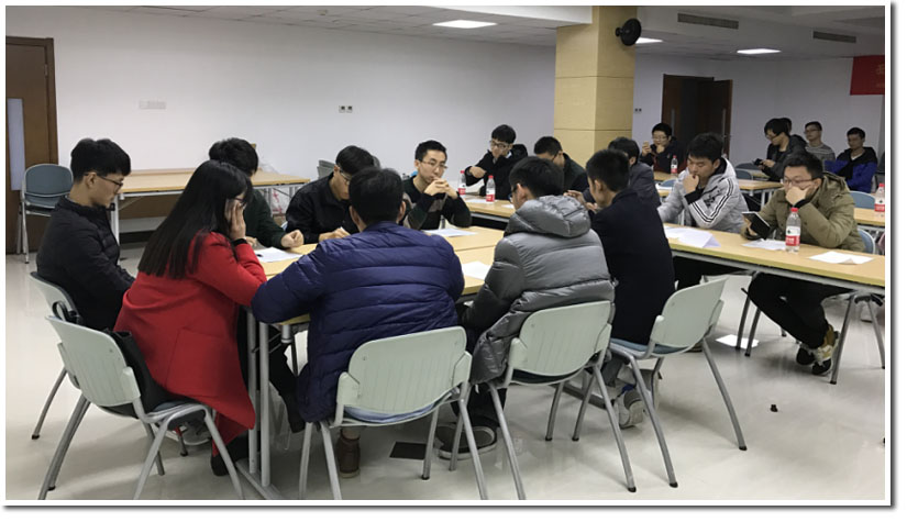接下来是模拟面试环节,比赛的形式为“无领导小组讨论”,要求选手对一个设定的话题展开讨论,发表自己意见,力求最终可以在小组内达成统一的共识。无领导小组面试分为A、B、C三个小组,每个小组由师兄担任评委。在无领导小组面试中,葛晓琴、翟翌童、李传冰和吴义强四位同学表现出色,赢得了最终面试的机会。