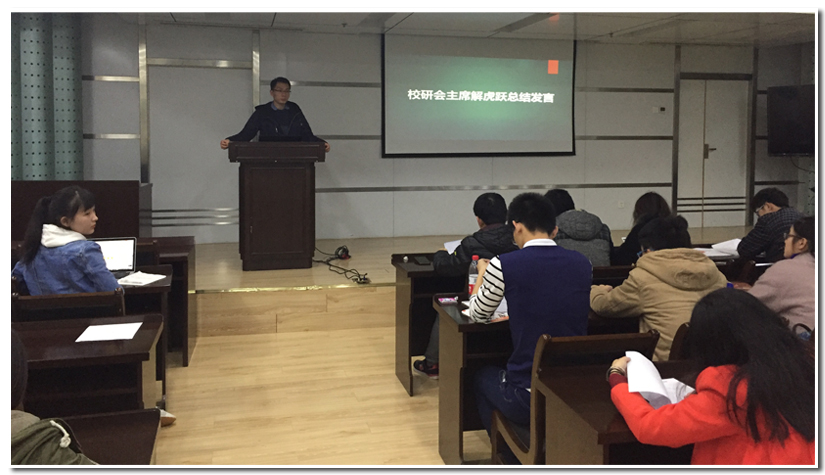 在12位院系相关项目答辩负责人做完精彩的答辩之后,校研究生会主席解虎跃对本次会议进行了总结。他首先肯定了此次会议的成果,表示此次会议目的在于锻炼各位负责人能力,为大家提供一个竞争交流以及展示自我的平台,同时在场的答辩评委们项目经验丰富,能给各位负责人提供建议,擦出思维碰撞的火花,在交流中进步,取长补短,提升组织的水平。并且借此各院系申请专项经费的契机,建立项目档案,使之有迹可循。其次他强调设立项目专项经费是为了调动各院系的积极性,希望各院系的活动能多姿多彩,形式新颖。他表示,这些经费是给各院系的福利,鼓励大家申请经费,希望各院系研究生会能体谅校研究生会的良苦用心,从更多更广的层面出发,使经费使用得更合理、更有价值。