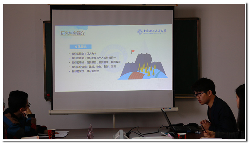 紧随其后发言的是中国科大研究生会常委钟鑫鹏,他着重向与会合工大研究生会代表们介绍了校研究生会的组织结构、工作模式、特色品牌活动等,同时也表达了研究生会工作给人的磨砺、锻炼与收获。
