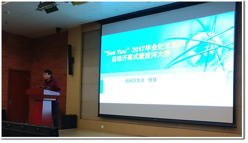 接下来是拔河比赛的介绍。负责人樊健同学开始强调了拔河比赛是系列活动的重要组成部分,接着展示了往年活动的精彩瞬间,然后介绍了赛制,比赛的参赛对象,时间地点等具体信息。最后强调了报名的方式并呼吁毕业班的同学们积极参与。