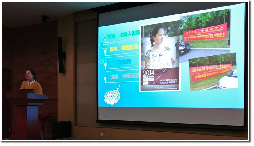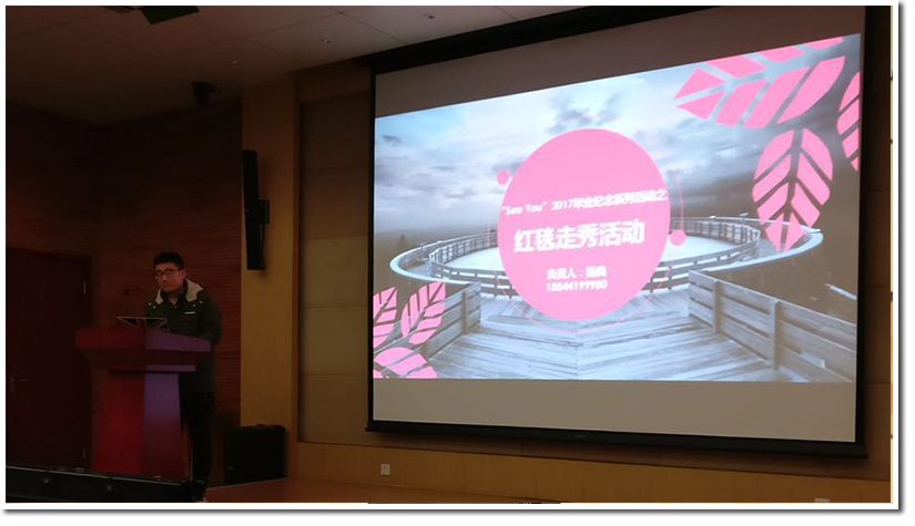 接下来文艺体育部部长吴衍麒对“SEE YOU”毕业系列活动进行了详尽的介绍。本次系列活动主要由开幕式、院系子活动、红毯、毕业晚会四部分组成,此系列活动已经成为科大的品牌活动,与此同时也表达了对即将毕业同学真挚的祝福。