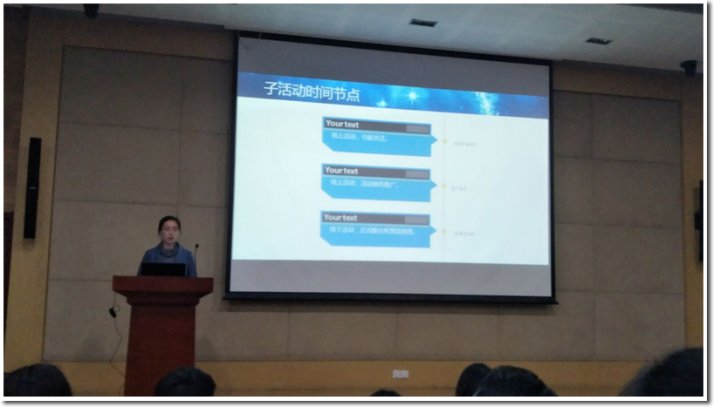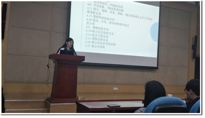 跟进常委施倩、刘晓茹分享了自我项目经历,也给我们提出了具有十分重要的建议:期待我们每个人都能够以积极乐观的态度对待项目实施中可能会面对的挫折,认真对待每一个小任务;同时也期待我们每个人都能真正的投入到项目中,提出自己的创意;最终收获“See You”毕业晚会的完美落幕,而我们每个人也将会从其中得到成长,收获项目组成员之间的情谊。