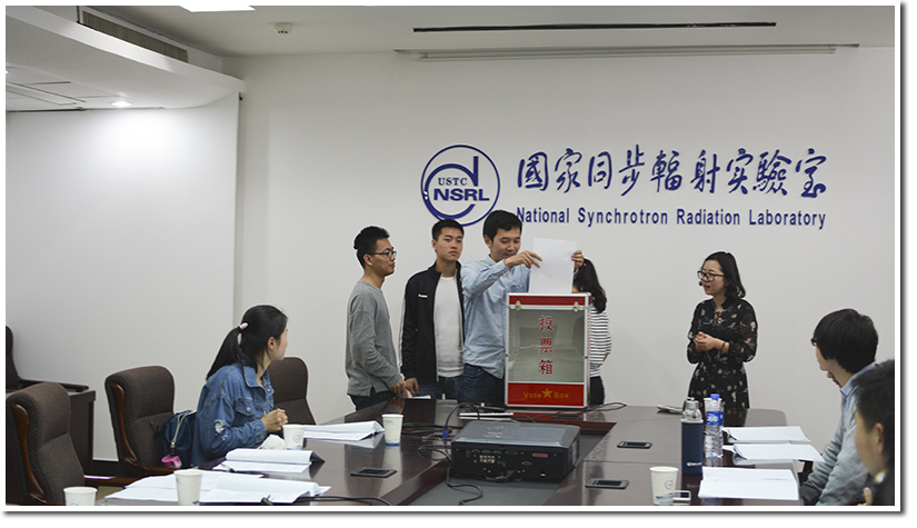 然后进行了国家同步辐射实验室研究生会新一届主席团成员和研究生代表的选举。首先由各位候选人进行演讲,然后在场具有投票权的同学进行投票。本次会议共选出国家同步辐射实验室研究生会主席团成员四名和研究生代表两名。