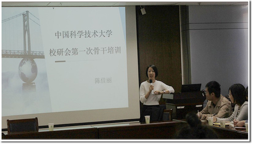 2017年11月5日下午14:30--16:30,中国科学技术大学研究生会人力资源部第一次骨干培训于东区教学行政楼地空学院702A706会议室顺利举行。本次培训邀请到的嘉宾为津桥国际集团安徽分公司总经理陈佳丽老师,校研究生会副主席、常委、部长(主任)和各院系研究生会主席参加了本次培训,会议由人力资源部干事许靖梅主持。