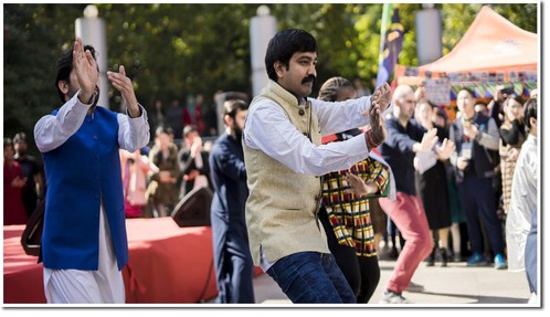 在舞台区,中国学生歌舞、太极拳、巴基斯坦舞蹈、孟加拉国歌曲、民乐团乐器演奏等,一场场精彩的表演让各国学生拍手称赞。节目间隙,项目组邀请留学生学习太极拳,欢乐的气氛让现场爆发出一阵阵雷鸣般的欢呼和掌声。最后,各国留学生穿上他们的民族服装,相继走上舞台,展示各自国家的特色文化与人文风俗,让观众们一饱眼福的同时,也感受到了各国民族文化的魅力。