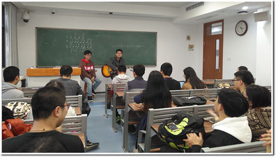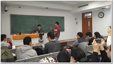 接下来整个活动的迎来了高潮,两位嘉宾合作为大家带来了吉他弹唱《第三人称》。整个教室回荡着悦耳的歌声,现场的同学也听得出神。一曲唱罢,众人还沉寂其中,久久不能自拔。