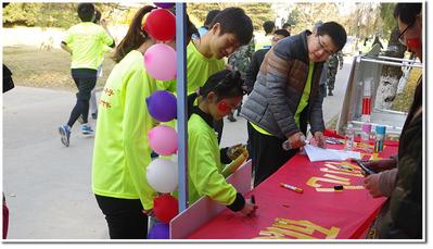 活动伊始,大家在校研究生会的休息区集合,领取活动的相关物资。值得一提的是,在休息区,我们采用“一二·九”运动的老照片烘托现场氛围,并且为大家提供了签名横幅供大家签名留念,以体现本次活动纪念“一二·九”运动的主题。同时,我们也设置了一块由校研究生会形象“研小蜂”以及九个部门形象轮廓组成的展板,供大家涂鸦上色,寓意着研会九个部门齐心协力,共同缔造更美好的研会。这些展示与活动充分调动了大家的情绪,凸显了活动的主题,为活动增添了几分色彩。