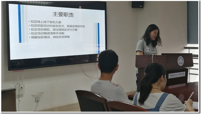 随后,各项目组组长对各组的分工进行了细致的介绍。首先是策划会务组组长罗勖,她以时间、形式、人员这三个方面为落脚点着重进行了阐述。同时她也对项目组成员提出了期望,希望大家能踏实工作、开动头脑、胆大心细。