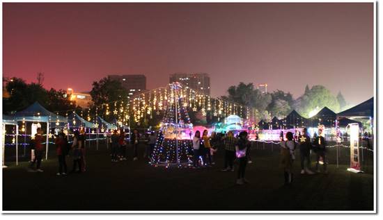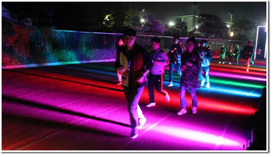 随着夜幕的降临,活动也将拉开序幕。晚上七点整,活动正式开始。首先,主持人彭纪媛跟大家详细介绍了活动规则,并提醒大家要“先热身再运动”。接着,在炫音社活力四射的演唱之后,迎来了开跑倒计时:“五四三二一!”。蓄势待发的人群在口令结束后,有序地穿过起跑线。跑道上闪烁的牛角、各色的荧光手环星罗棋布,伴随着参与者的步伐,形成了一道道律动的光,让现场充满青春的气息与活力。闪烁的荧光跑道,璀璨的灯光操场吸引了许多感兴趣的人前来参加。