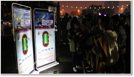 本次“益跑”活动分为两个大区域:荧光夜跑区和趣味活动区,其中趣味活动区又分为希望灯塔及荧光涂鸦两个小区域。荧光跑道上运动者跑过数圈之后,完成了任务到成果登记区记录所跑的圈数。虽然跑完之后大汗淋漓、气喘吁吁,但他们却满脸笑意,欢声笑语地进入趣味区玩耍。五彩斑斓的灯塔区,烘托着温馨又恬静的氛围,前来拍照合影的人群络绎不绝。灯塔两侧放置的此次活动梦想基金捐助地宁夏海源贫困山区学校的介绍展板,突出了本次活动“公益”的主题,吸引了许多人驻足观看。