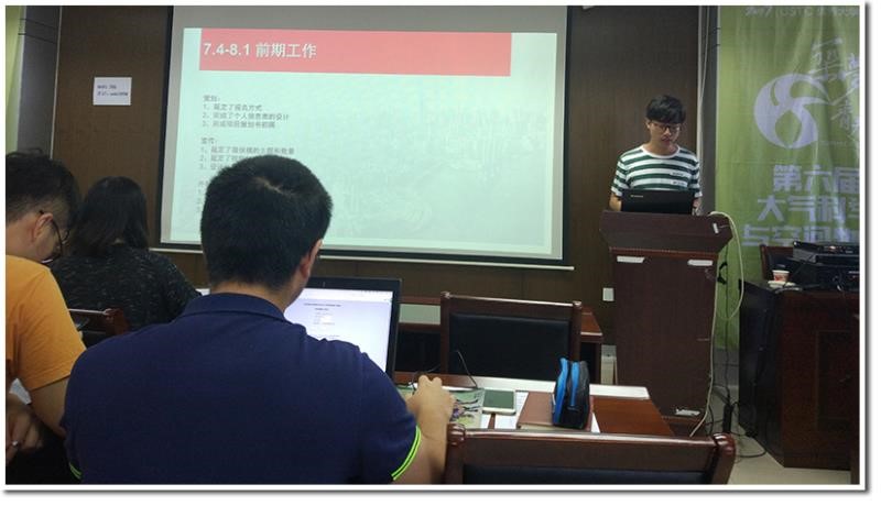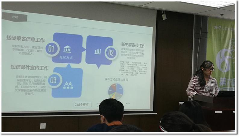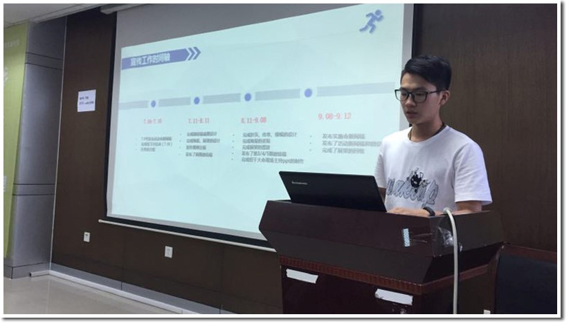 紧接着,策划会务组副组长项雪纯、宣传组组长王国富、外联赞助组组长朱珊分别总结了各自职能小组在项目中的工作。他们从小组成员及分工、完成工作、项目实施中的不足与思考等方面进行了总结以及经验分享。