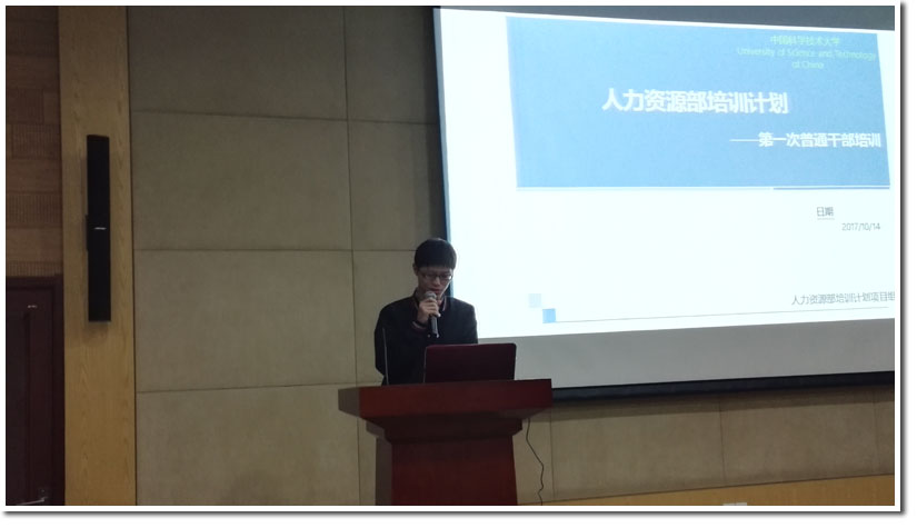 10月14日上午九点三十分,中国科学技术大学研究生会人力资源部2017-2018学年第一学期第一次干事技能培训正式开始。到场嘉宾有:校研究生会常委陈务远,人资部长张岑岑,宣传部长周澍。培训嘉宾则是宣传部副部长罗勖、宣传部副部长项雪纯以及外联部副部长王国富。本次培训由人力资源部干事许婧梅主持。
